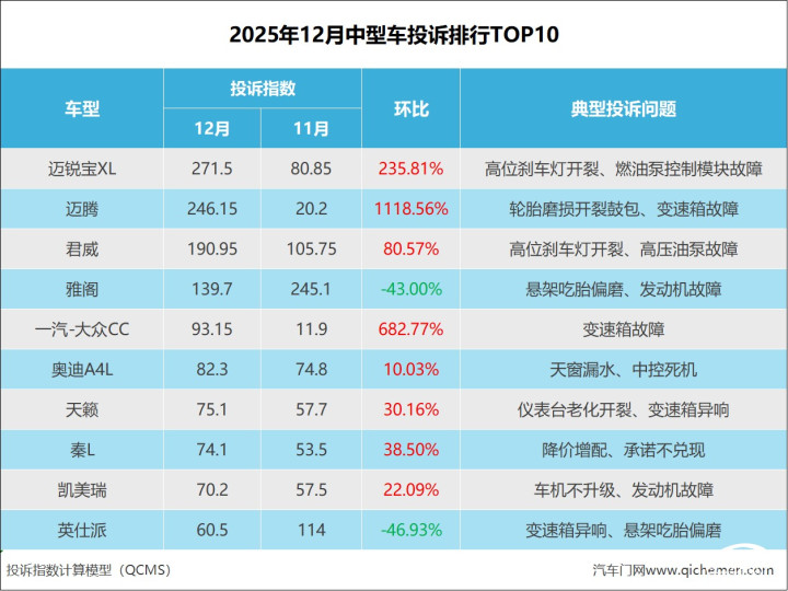 转眼间,2025年进入尾声,迎着2026年的脚步,12月中型车投诉指数出炉。数据显示,中型车总体投诉指数为2331.05,环比暴涨38.08%。在本月投诉榜TOP10中,投诉指数上涨车型豪取8席,其中涨幅最大车型为大众迈腾,暴涨1118.56%,位居榜眼位置。深究原因,变速箱紧急状态故障成了直接因素。该问题在大众多款车型中都有出现,可能存在设计通病。而两款投诉指数下跌车型中,英仕派降幅最大,有着46.93%的降幅,相较上月服务态度差的投诉明显减少,变速箱异响的投诉有些许增涨。